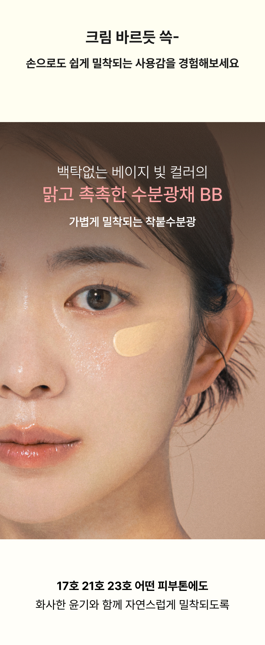 봄도 되었고 화장을 가볍게 하고 싶었는데 발림성도 좋고 제 피부톤에도 잘 맞는거 같습니다. 완전한 커버력이 필요하신분은 비추이고 운동하러갈때 가볍고 빠르게 간편하게 이 느낌으로 사용하니깐 좋으네요